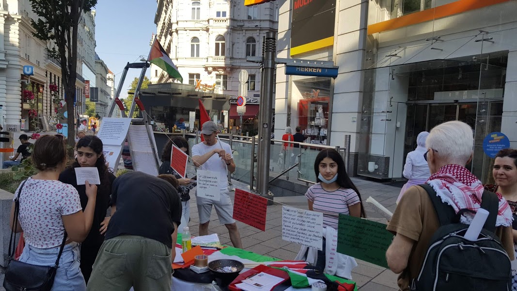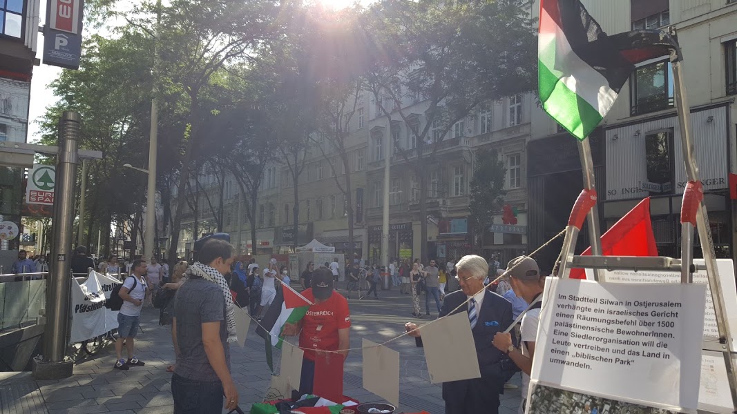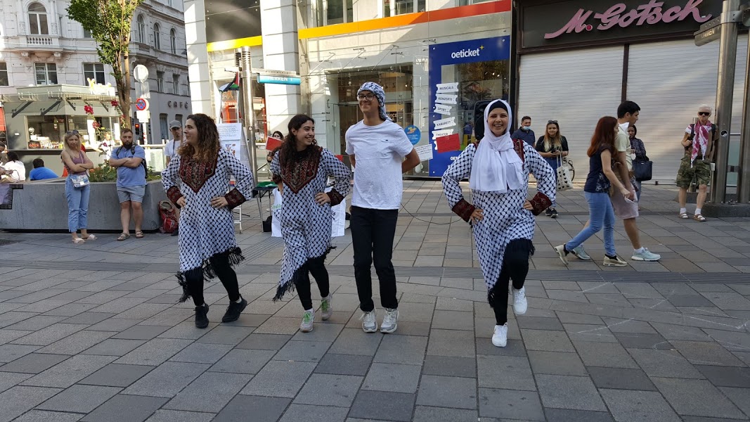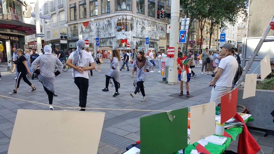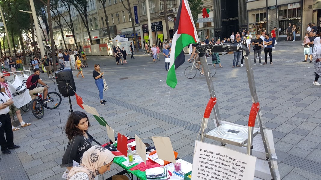 Mit unserem monatlichen Infotisch haben wir uns wieder auf die Mariahilferstraße platziert, um auf die aktuelle Situation in Palästina, besonders in Ostjerusalem, aufmerksam zu machen. Martin W. und Franz S. berichteten über die Vertreibungen der PalästinenserInnen aus ihren Häusern in Ostjerusalem und der allgemeinen Unterdrückung der PalästinenserInnen im gesamten Land. Viele PassantInnen informierten sich und zeigten sich solidarisch - mit uns und vor allem mit Palästina. Außerdem wurden wir von einer kreativen Dabke Tanzeinlage von Handala begleitet.