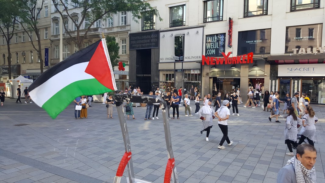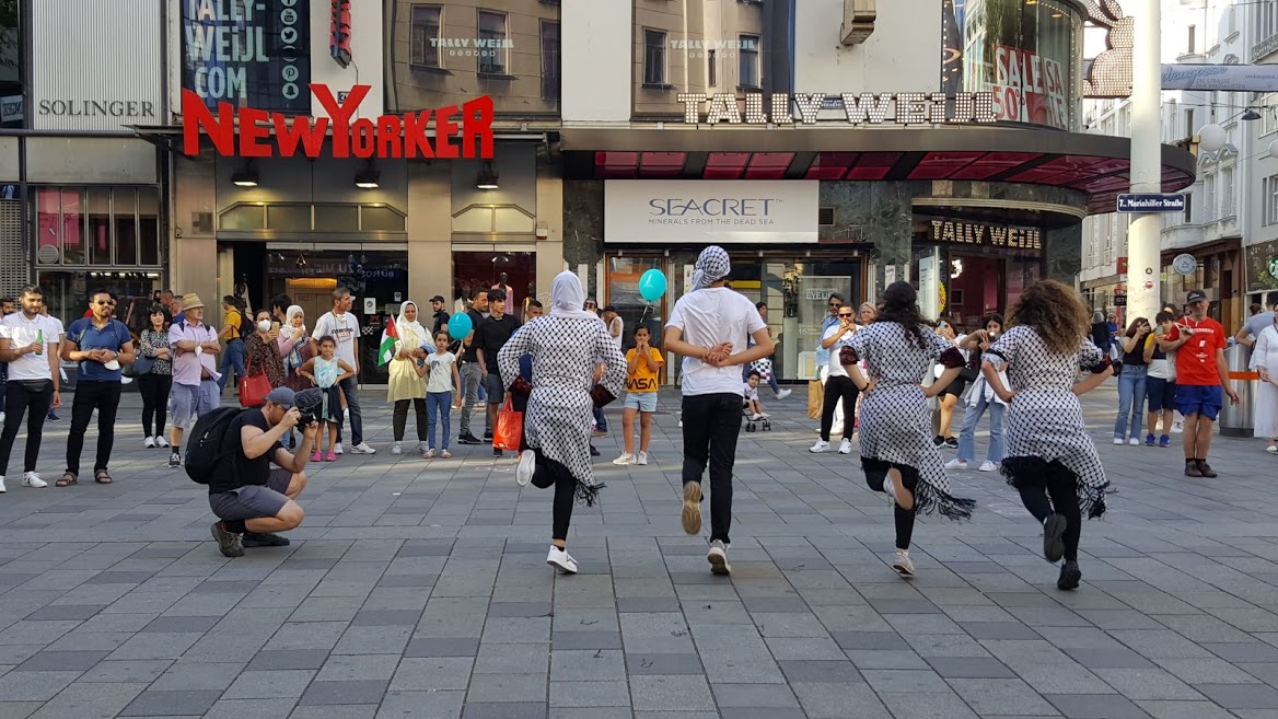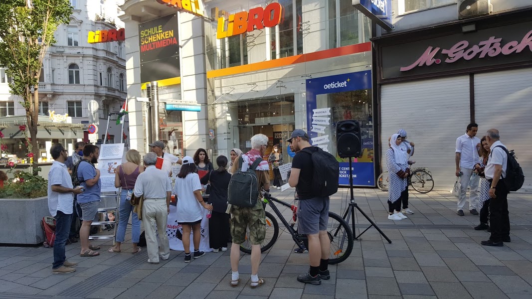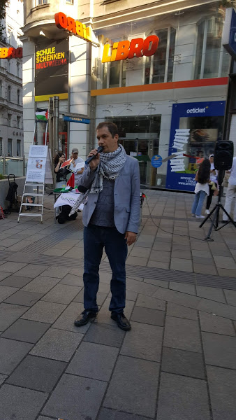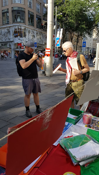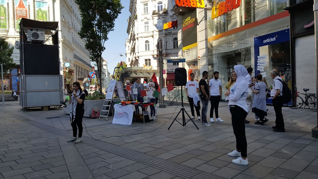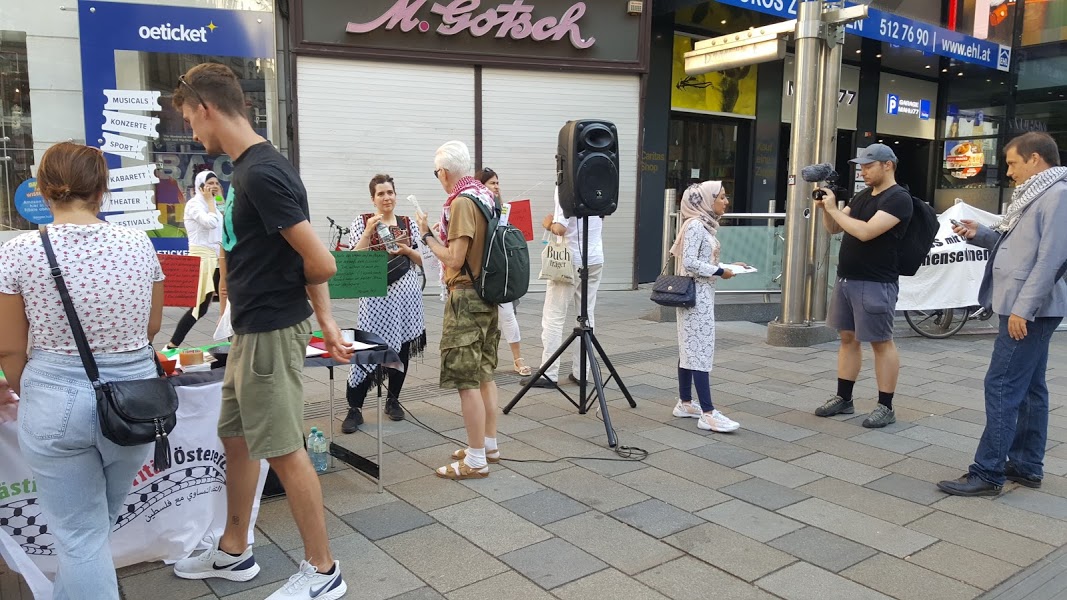Mit unserem monatlichen Infotisch haben wir uns wieder auf die Mariahilferstraße platziert, um auf die aktuelle Situation in Palästina, besonders in Ostjerusalem, aufmerksam zu machen. Martin W. und Franz S. berichteten über die Vertreibungen der PalästinenserInnen aus ihren Häusern in Ostjerusalem und der allgemeinen Unterdrückung der PalästinenserInnen im gesamten Land. Viele PassantInnen informierten sich und zeigten sich solidarisch - mit uns und vor allem mit Palästina. Außerdem wurden wir von einer kreativen Dabke Tanzeinlage von Handala begleitet.