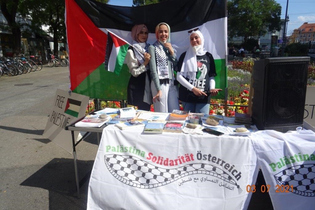 Mit Ansprachen und 600 verteilten Flugblättern informierten wir über Israels kolonialistische Unterdrückung und das von ihm gegenüber der palästinensischen Bevölkerung zwischen Mittelmeer und Jordan errichtete System der Apartheid im Allgemeinen, aber auch über die aktuellen ethnischen Säuberungen in Ostjerusalem und in der Westbank. Erfreulich waren das große Interesse und die Zustimmung der PassantInnen.