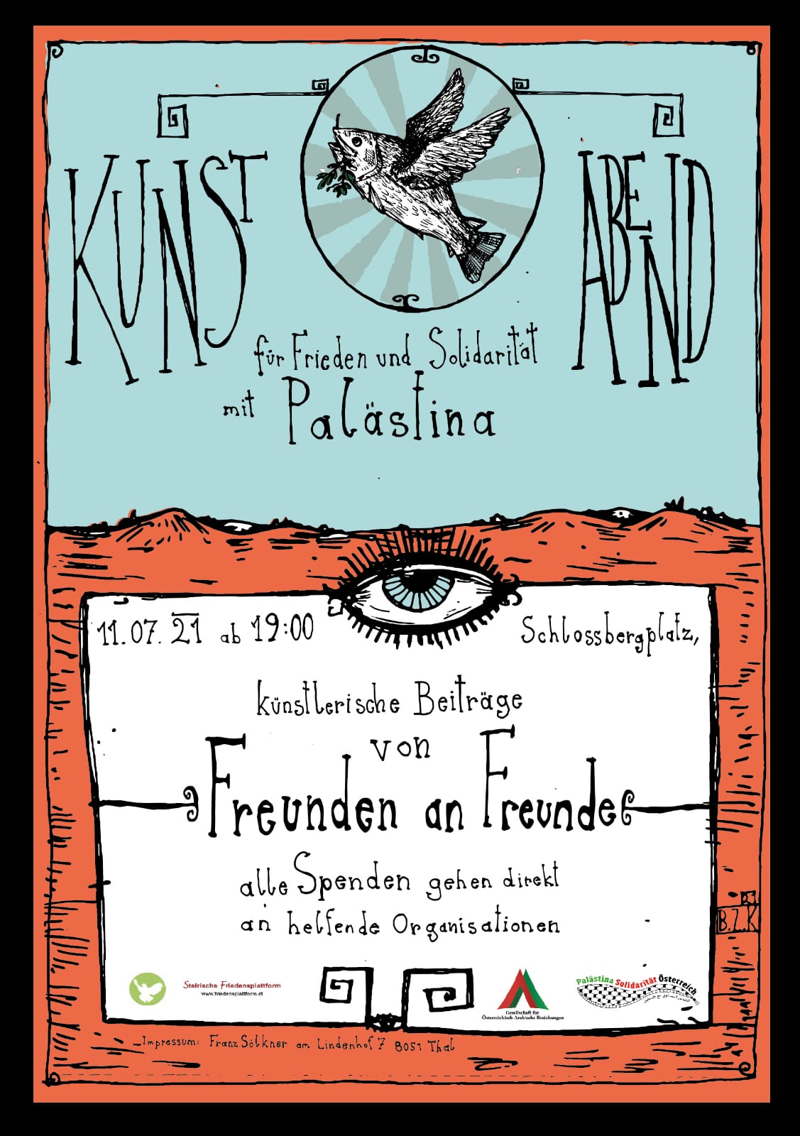 Migrantische KünstlerInnen laden für kommenden Sonntag, den 11. Juli um 19:00 am Grazer Schloßbergplatz zu einem Benefiz-Solidaritäts-Abend für Palästina ein.