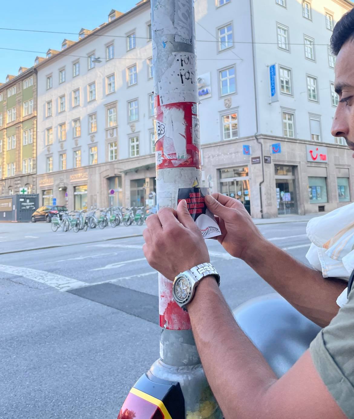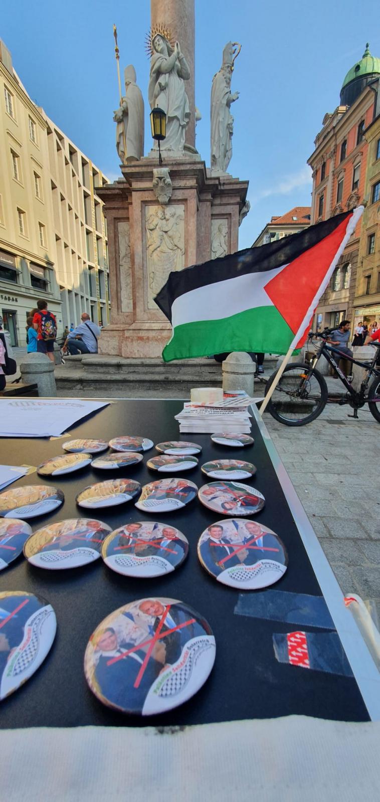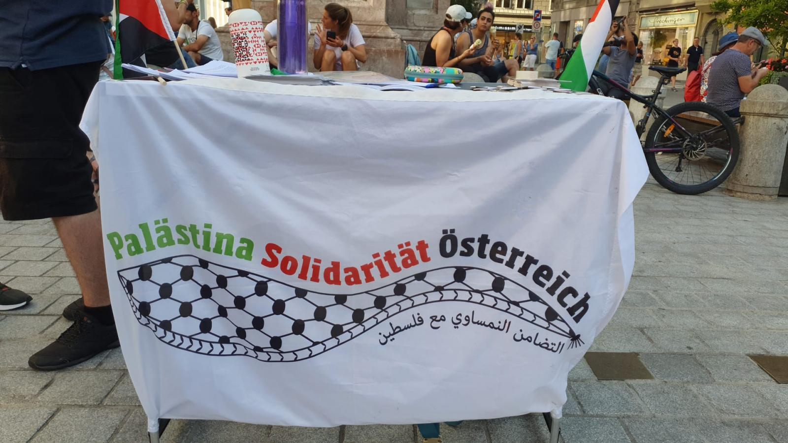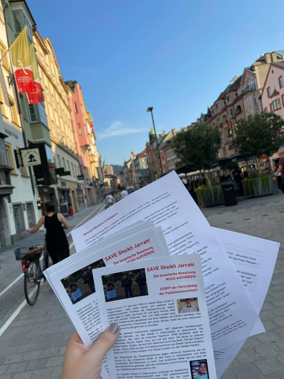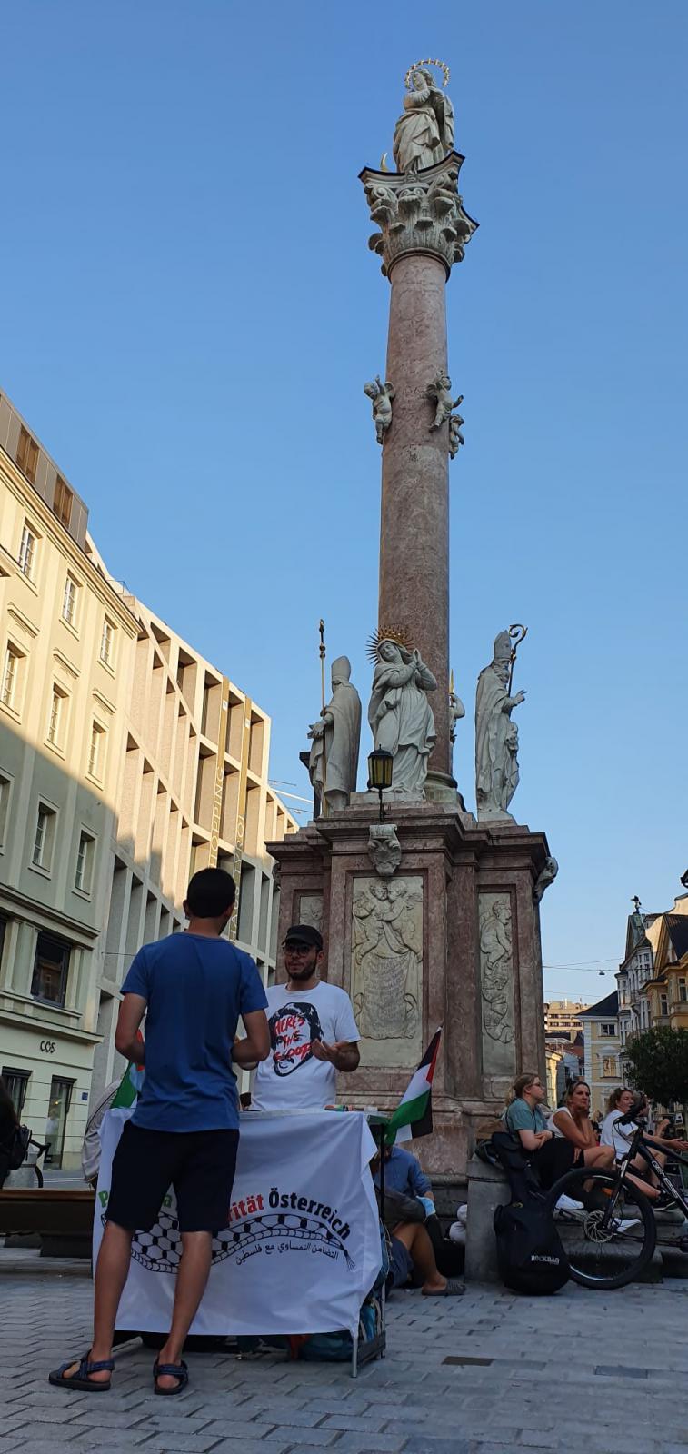 Erfolgreich hat eine kleine Gruppe von unseren "Palästina Solidarität Aktivist*innen" heute Abend einen weiteren Infotisch vor der Annasäule in Innsbruck veranstaltet. Neben zahlreichen Flugblättern, welche verteilt wurden, wurden auch eine Menge unserer Aufkleber ausgeteilt und einige Unterschriften für unsere Petition ("Nein zur Vertreibung der Palästinenser*innen") an die Bundesregierung gesammelt.