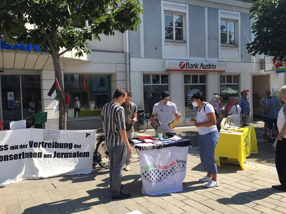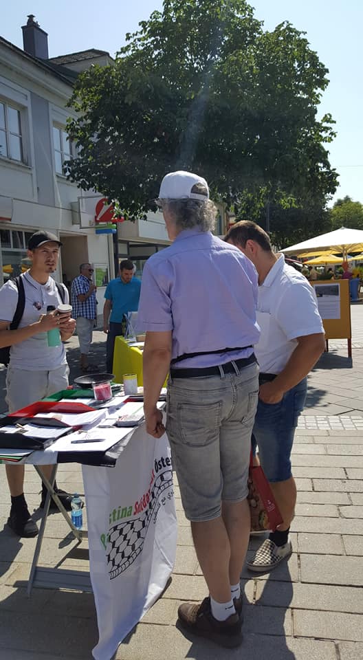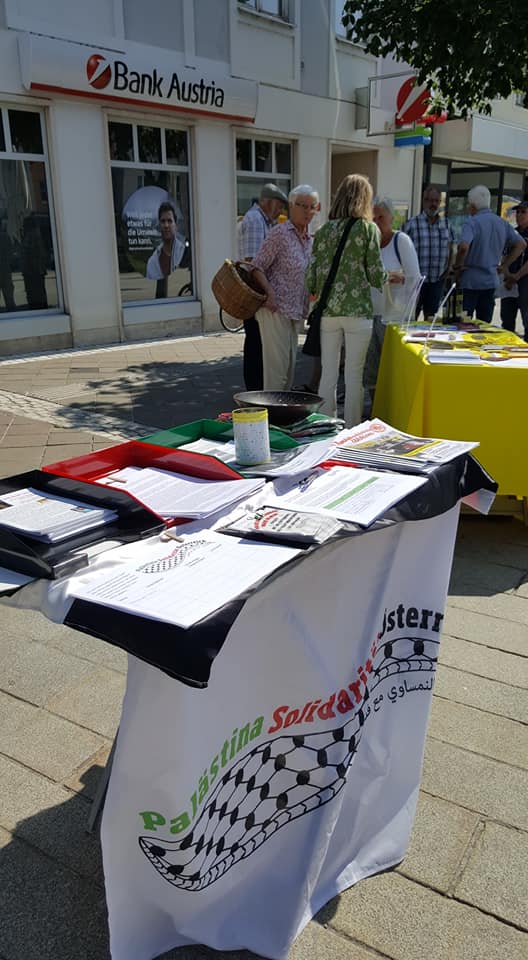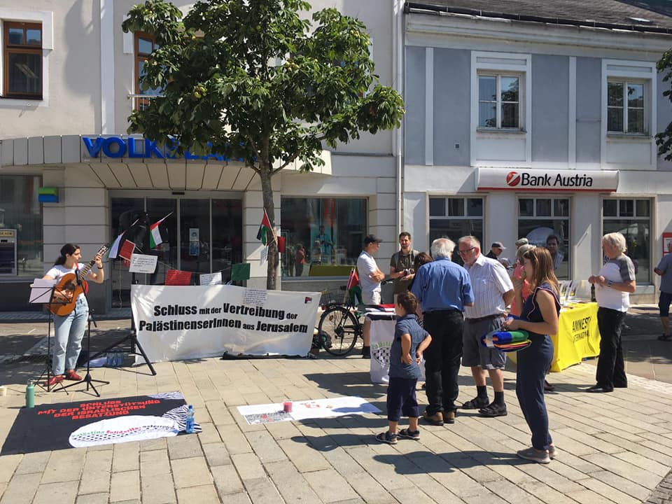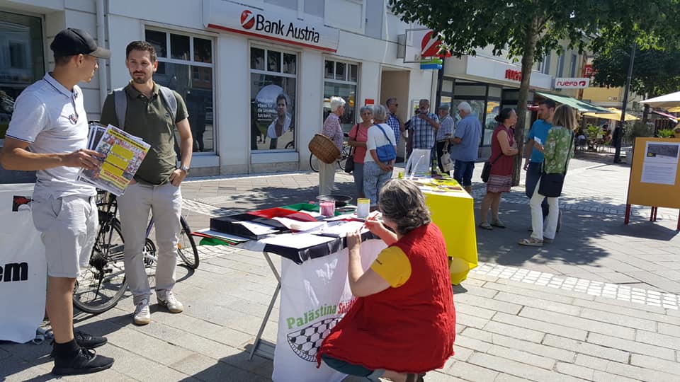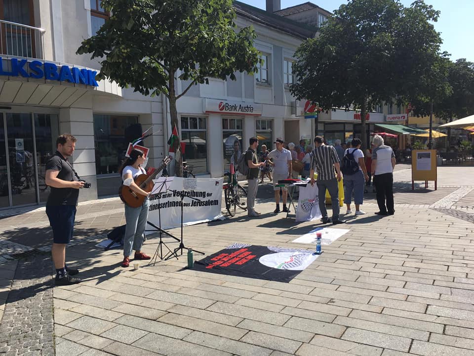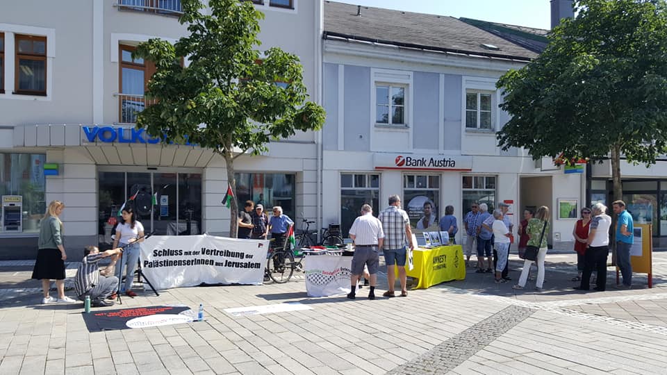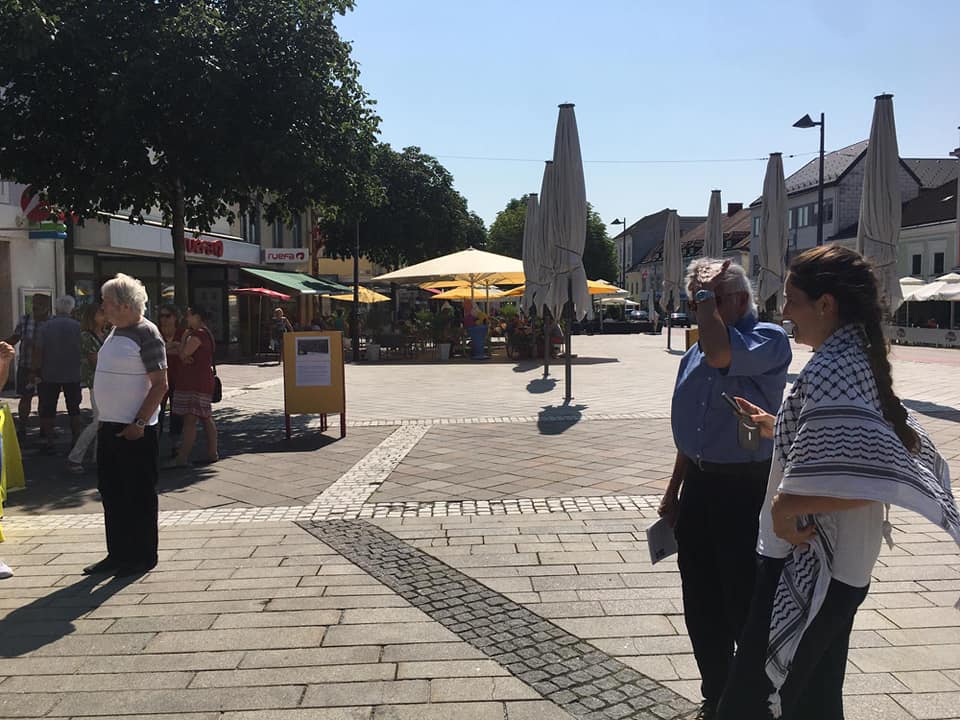 Gemeinsam haben wir heute mit Amnesty International und Pax Christi auf die koloniale Siedlungspolitik Israels aufmerksam gemacht. Viele Passant*innen haben in dem ansonsten an Julisamstagen verschlafenen Städtchen Amstetten ihre Aufmerksamkeit auf uns gerichtet, sich informiert und Flugblätter dankend und zustimmend entgegegen genommen. Es wurden außerdem sehr viele Unterschriften für unsere Petition "Nein zur Vertreibung der Palästinenser*innen" gesammelt.
