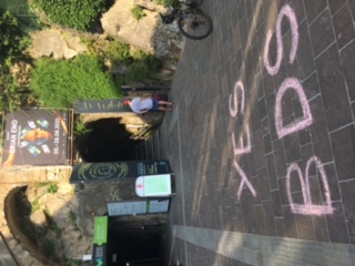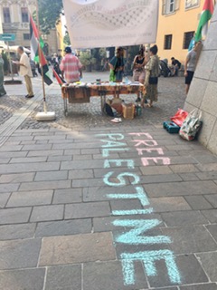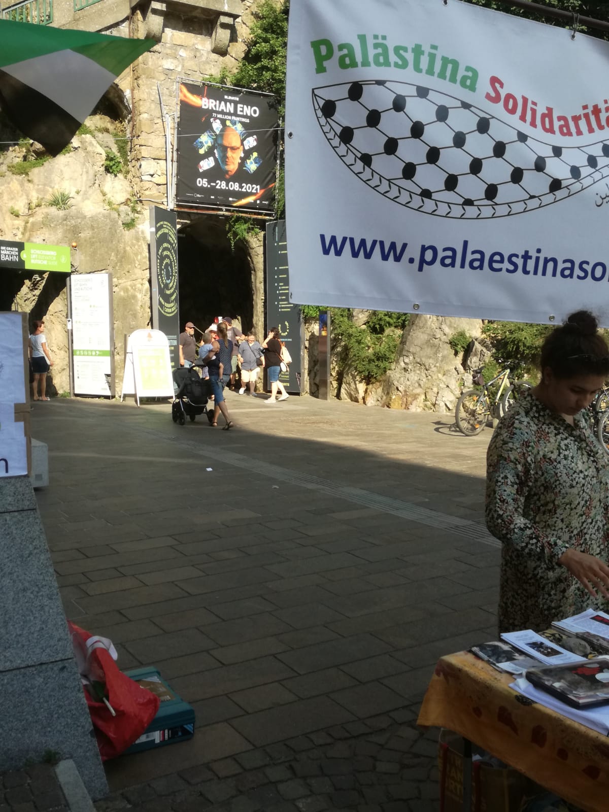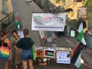 Der zweite Infostand "Brian Eno supports BDS" fand am Samstag, 15.8.21 in Graz vor dem Ausstellungseingang am Schloßbergplatz statt.