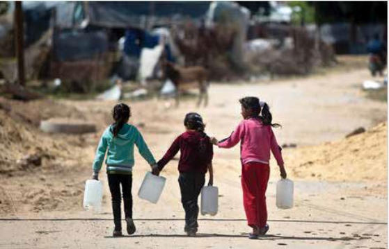 - Der Pro-Kopf-Verbrauch zwischen den Menschen innerhalb Israels und den arabischen BewohnerInnen der Westbank ist extrem ungerecht verteilt. Die Welt-Gesundheits-Organisation/ WHO hat den täglichen individuellen Wasserbedarf einer Person für ein menschenwürdiges Leben (Nahrung, Hygiene und Reinigung) auf 100 Liter/Tag festgelegt. Nur 16% der palästinensischen Bevölkerung der besetzten Gebiete liegen über diesem Wert. 42 % können zwischen 50 und 100 l/Tag verbrauchen, 36% zwischen 30 und 50 l und 7% gar weniger als 30 Liter am Tag. Hingegen stehen den Israelis durchschnittlich 260 l/Tag zur Verfügung.