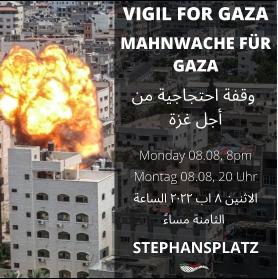 Aufgrund des Grauens der fortgesetzten Bombardierungen Gazas und der Tötung von unzähligen Menschen treffen wir uns am Montag um 20:00 am Stephansplatz mit Kerzen, Fahnen, statements und Bildern der verstorbenen Kinder, Mütter, Väter..., um in Ruhe und Stille der Ermordeten zu gedenken und aller Palästinenser*innen, die in Gaza die Hölle durchleben. Die Stille soll die lauteste Stimme sein, die nicht zum Schweigen gebracht werden kann.