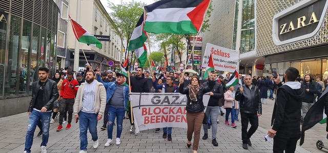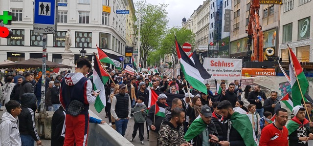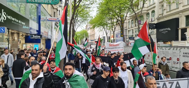 Nach einer Auftaktkundgebung formierte sich ein Demozug und zog durch die Mariahilfer Straße bis zur Theobaldgasse. Die Demo verlief langsam, dafür umso stimmgewaltiger. „Freiheit, Freiheit für Palästina!“, „Free, free Palestine!“ und „Boycott Israel!“ machten das Anliegen lautstark bemerkbar und brachten auch die Passant:innen damit in Berührung, während Flugblätter verteilt wurden. Die starke und kräftige Stimmung hielt auch bei der Schlusskundgebung an. Die zahlreichen Reden verschiedener Aktivist:innen repräsentierten die ganze Breite des Spektrums der Kräfte, die sich für die Freiheit und Selbstbestimmung Palästinas einsetzen. Ein zentrales, vorgebrachtes Anliegen war auch der Aufruf an die österreichische Regierung, endlich die Neutralität Österreichs wiederherzustellen und die militärischen und sicherheitstechnologischen Kooperationen mit Israel sofort zu beenden – die Petition der Palästina Solidarität Österreich kann hier unterzeichnet werden.