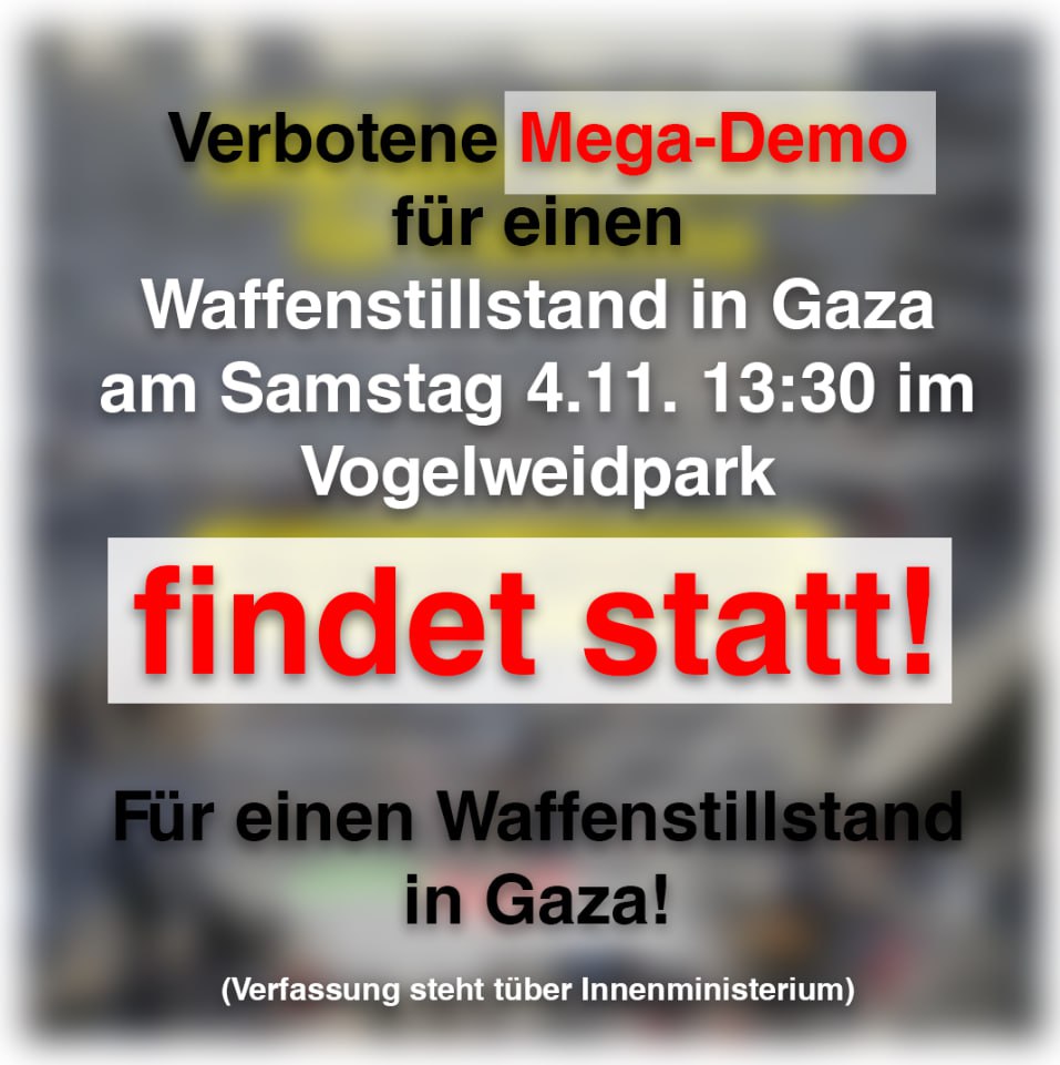 Wir werden demonstrieren: für die Demokratie, Freiheit und Gleichheit, für den Frieden, gegen Apartheid und Kolonialismus, für die Neutralität und die Verfassung und gegen die Regierung, die für Apartheid, Kolonialismus, Meinungsdiktatur, Unfreiheit, Krieg und Gewalt steht – retten wir Österreich vor diesen Radikalisierern, Hetzern und Kriegstreibern.