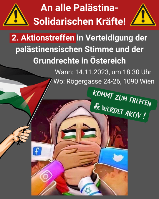 Wir laden zu einem weiteren dringenden Aktionsplenum am 14. November 2023, um 18:30, in der Rögergasse 24-26, 1090 Wien um 18.30 Uhr ein.