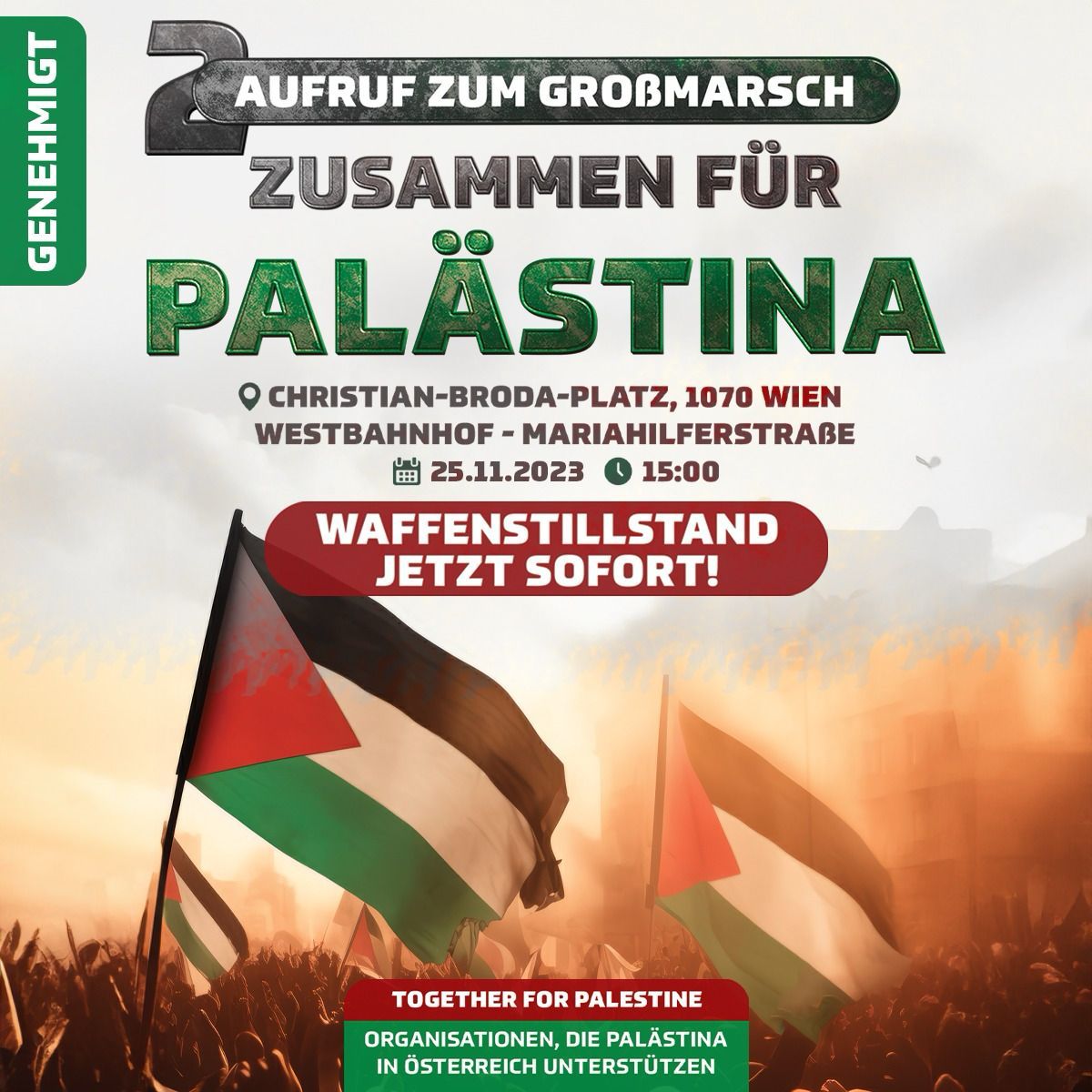 Termin: 25. November 2023 - 15:00Waffenstillstand jetzt sofort! Aufruf zum Großmarsch "Zusammen für Palästina" Christian-Broda-Platz, 1070 Wien, Westbahnhof-Mariahilferstraße
