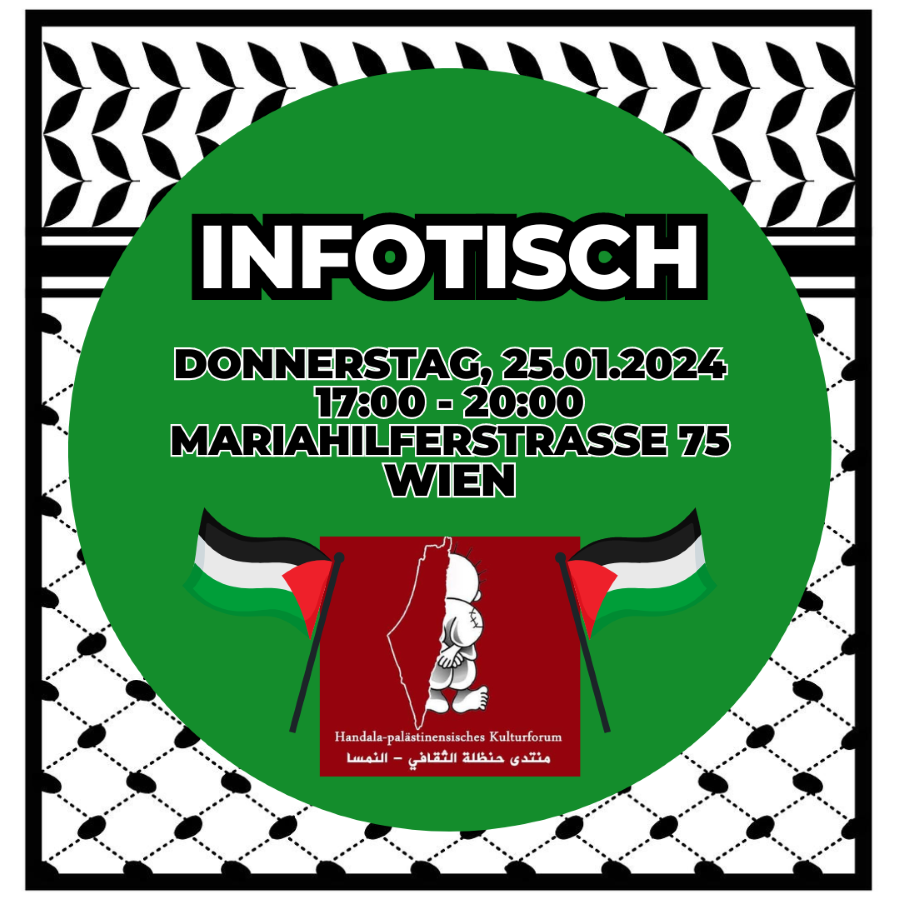 Termin: 25. Januar 2024 - 17:00Der nächste wöchentliche Infotisch in Wien findet am Donnerstag, 25.Jänner um 17:00 auf der Mariahilferstraße 75 statt. Sei dabei! #CeasefireNOW #StopOccupation #FreePalestine