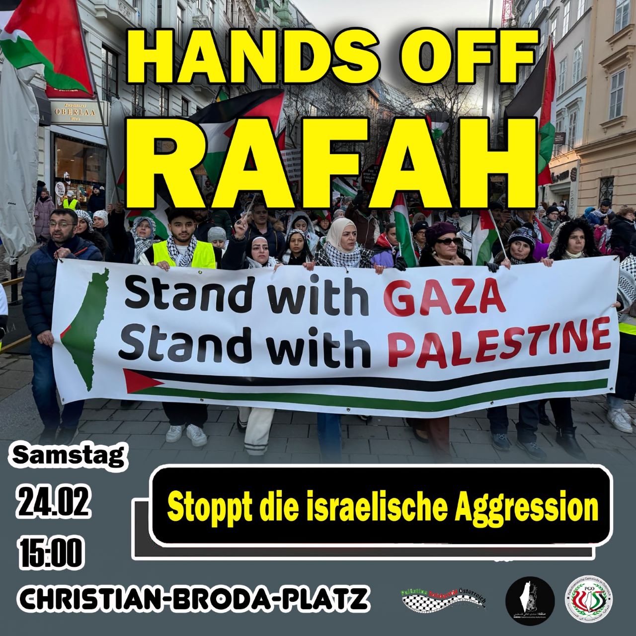 Termin: 24. Februar 2024 - 15:00Stoppt die israelische Aggression! Hands off Rafah! Samstag 24. Februar 2024, 15 Uhr, Christian-Broda-Platz