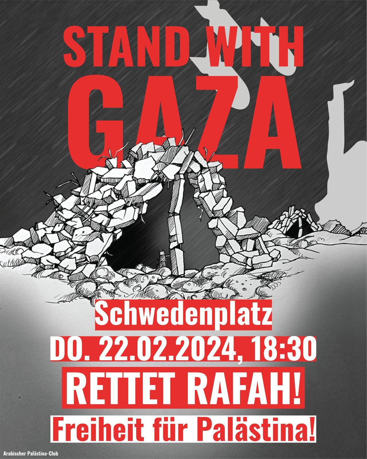 Termin: 22. Februar 2024 - 18:30Stand with Gaza! Rettet Rafah! Donnerstag 22. Februar 2024, 18:30, Schwedenplatz, Wien Freiheit für Palästina