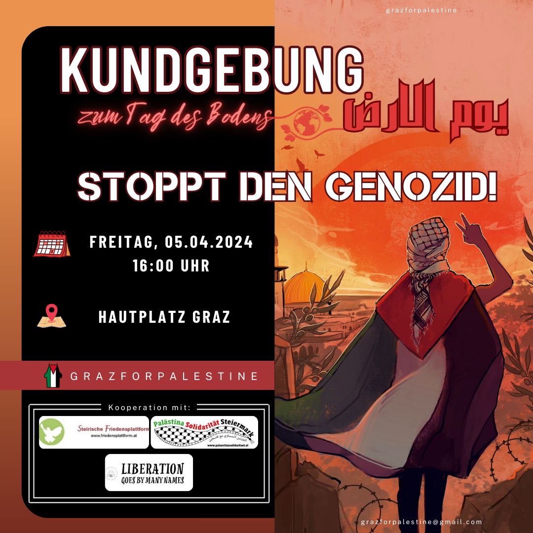 Termin: 5. April 2024 - 16:00Kundgebung zum Tag des Bodens Stoppt den Genozid 5. April.2024 16 Uhr Grazer Hauptplatz