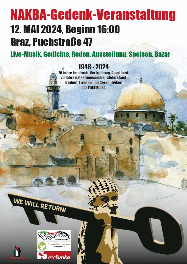 Termin: 12. Mai 2024 - 16:00Live-Musik, Gedichte, Reden, Ausstellung, Speisen, Bazar 12. Mai 2024, Beginn 16 Uhr Graz, Puchstraße 47