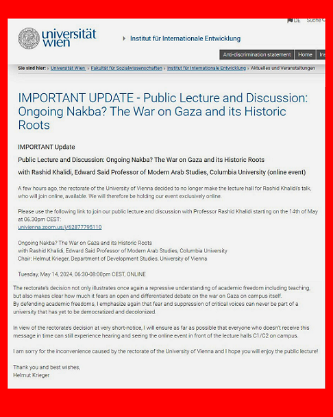 English: Rectorate of the University of Vienna cancels lecture hall for renowned Professor Rashid Khalidi of Columbia University!